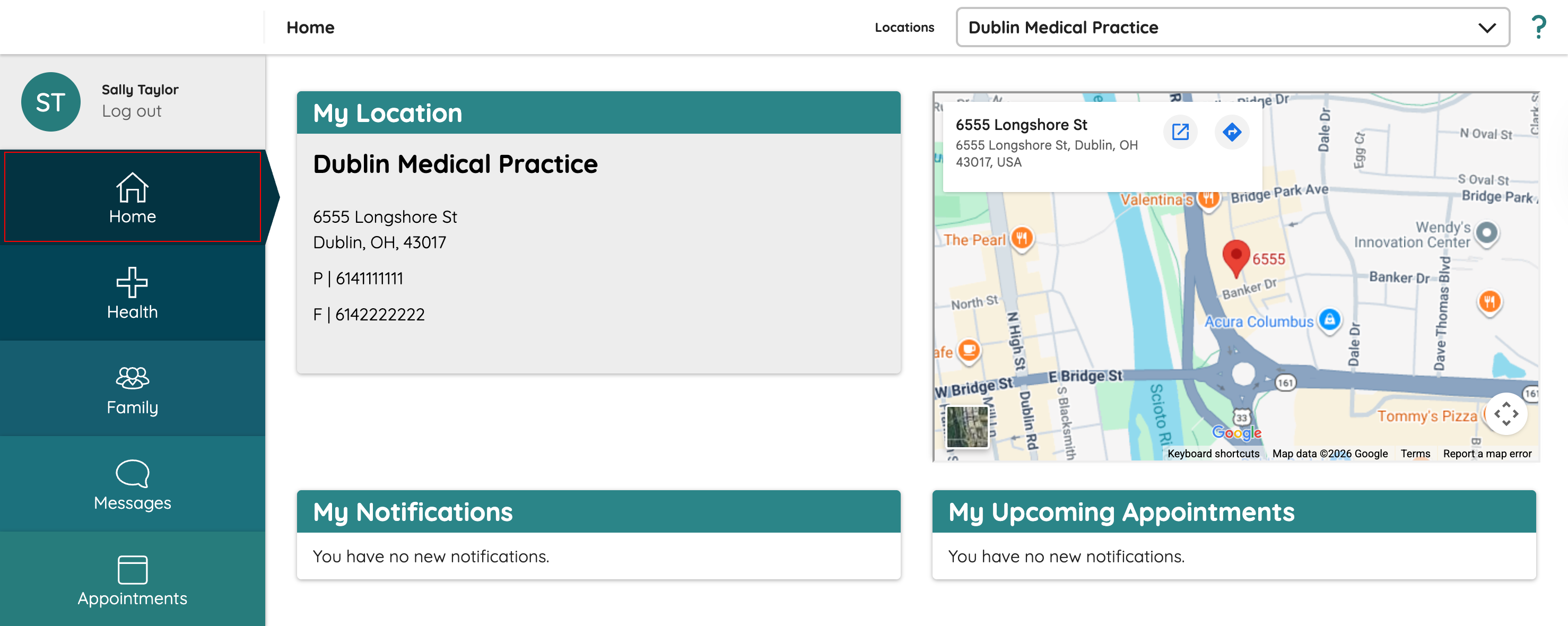 The My Location section provides information about the practice currently selected in the Locations field in the upper right corner of the Patient Portal.