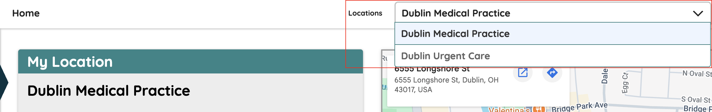 If you see healthcare providers at another location associated with this practice, you can display information about that location by selecting the Locations drop-down and then selecting the facility name.