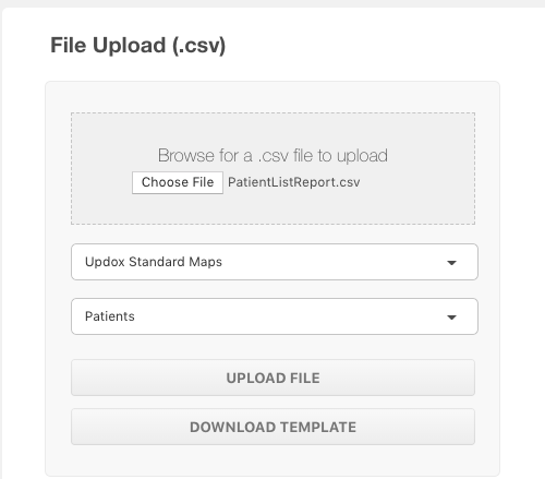 Choose your patient-upload file from your device. In the first dropdown, choose Updox Standard Maps, then Patients. Click Upload File to start the upload.