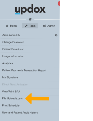 To access the file upload area in Updox, click on Menu - Tools - File Updox (.csv)