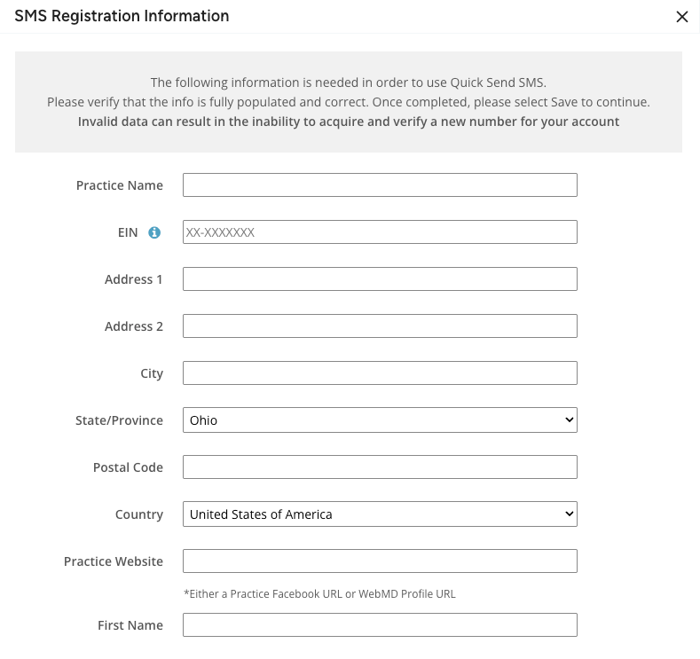 You must fill out your business information for SMS number verification before requesting an SMS phone number. If you don't complete this information, you'll be prompted to fill out a form with the missing information.